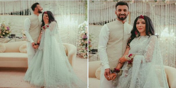 As the couple prepared for their big day, a video of them exchanging rings in a private ceremony went viral on social media. The bride-to-be, Nische, looked radiant in a Chrysler-toned dress adorned with red flowers and minimal jewelry, while Shan kept things simple with a traditional white kurta shalwar and waistcoat. Here’s the video,