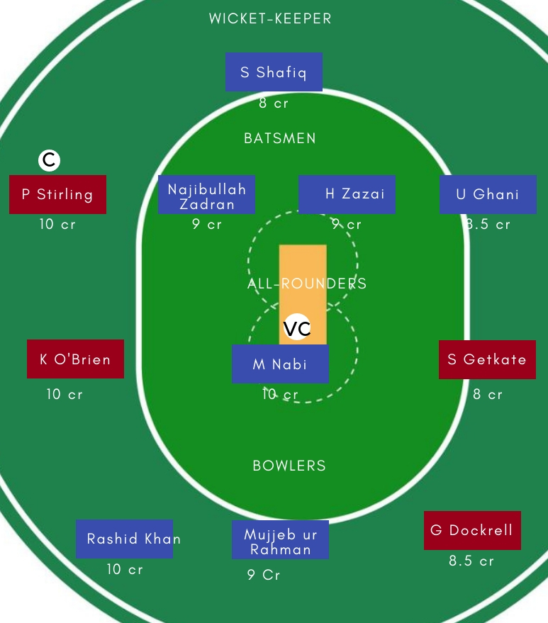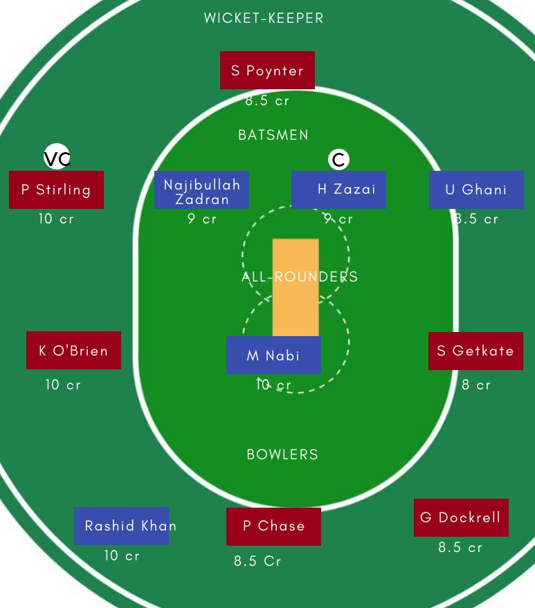बल्लेबाज – बल्लेबाजी में Paul Stirling, Asghar Afghan, Hazratullah Zazai, Najibullah Zadran, Andrew Balbrinie सबसे अच्छे विकल्प होगें. Zazai ने दूसरे टी20 में ऐतिहासिक पारी खेलकर कोहराम मचा दिया है. वही, Paul Stirling ने भी शानदार पारी खेली.