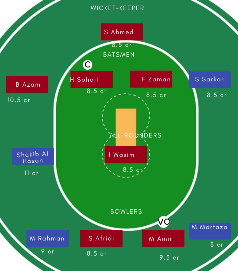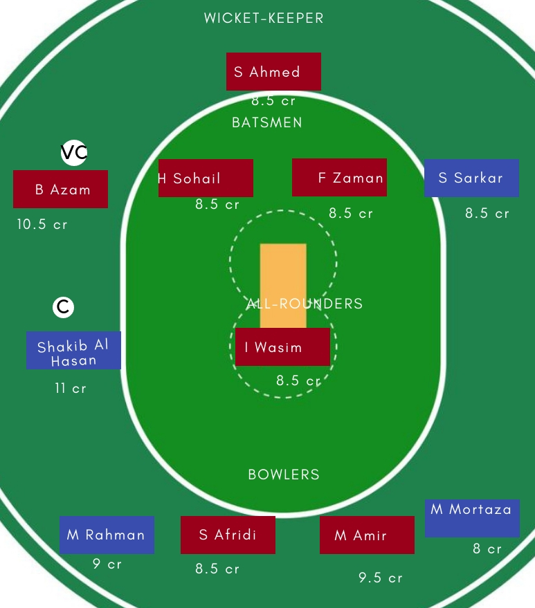 बल्लेबाज: Babar Azam, Imam Ul Haq, F Zaman, H Sohail