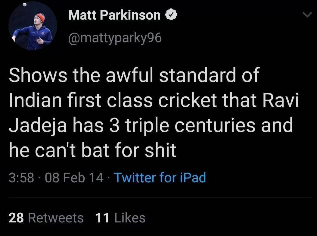 He also didn’t spare all-rounder Ravindra Jadeja and took a jibe on him for scoring three triple centuries in the Indian domestic circuit. Here’s the tweet;