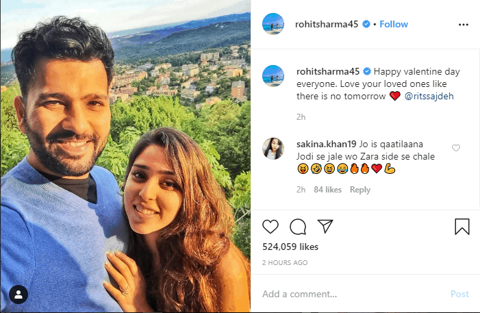 Rohit Sharma never fails to impress whether it is on the ground or in his love life. Rohit has shared an adorable picture with his wife Ritika wishing his fans a Happy Valentine’s Day this morning. In the post he has taken a selfie with wife Ritika Sajdeh in which they both are looking in love. Rohit has captioned the post, “Happy Valentine’s day everyone. Love your loved ones like there is no tomorrow @ritssajdeh.”
