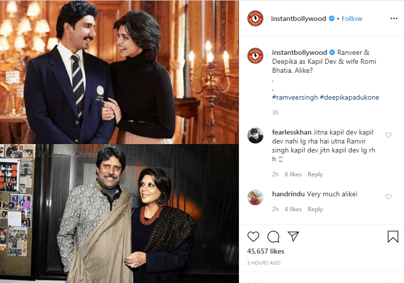 The makers of upcoming sports drama ’83’ after introducing Ranveer as Kapil Dev and his team as Kapil’s Devil, have revealed the first look of Deepika Padukone as Romi Bhatia. The fans are going crazy watching the uncanny resemblance of both the actors to the legendary cricketer and his wife.