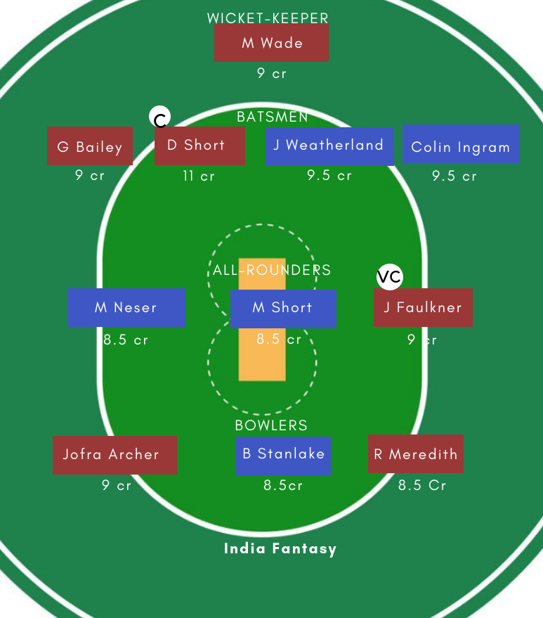 Johan Botha, Matthew Wade (C), Clive Rose, David Moody, Riley Meredith, Jofra Archer, James Faulkner, George Bailey, Alex Doolan, Caleb Jewell, Ben McDermott, Simon Milenko, D’Arcy Short