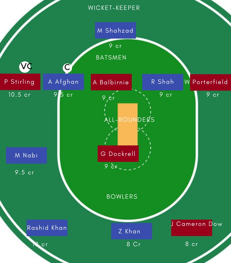 बल्लेबाज – बल्लेबाजी में Paul Stirling, Asghar Afghan, William Porterfield, Andrew Balbirnie सबसे अच्छे विकल्प होगें। Asghar Afghan इस समय बेहद शानदार फॉर्म में मौजूद है। वही, Andrew Balbirnie ने वनडे सीरीज में बढिया बल्लेबाजी का प्रदर्शन किया था।