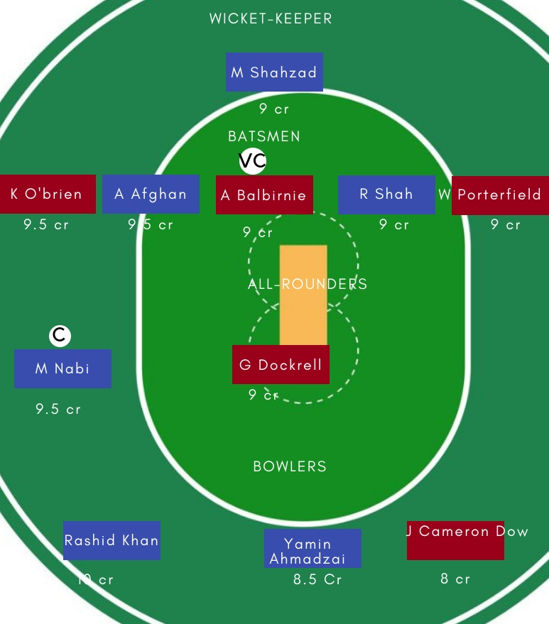 ऑलराउंडर – ऑलराउंडर के तौर पर Mohmmad Nabi, G Dockrell सबसे अच्छे विकल्प होगें।दोनों ही खिलाड़ी बल्ले और गेंद दोनो से अहम योगदान देने में सक्षम है।