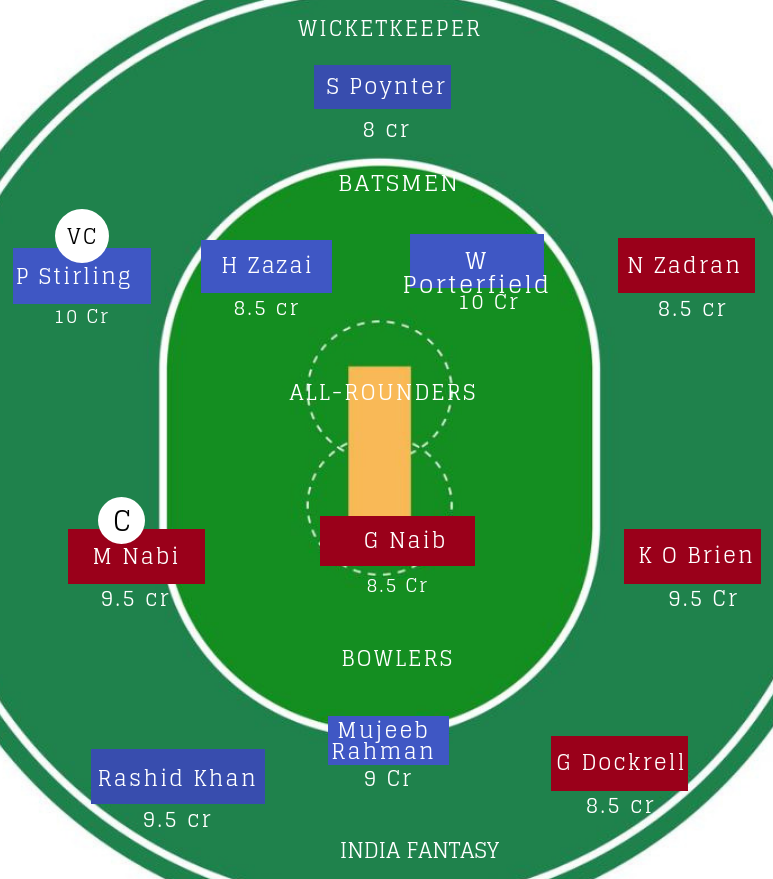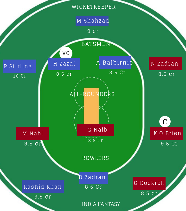 ऑलराउंडर : M Nabi को अपनी टीम का कप्तान जरूर ही बनाएं. आप नबी को कभी भी इग्नोर नहीं कर सकते. ये खिलाड़ी अपने दम पर आपको ड्रीम 11 कंटेस्ट जीता सकता है. Gulbadin Naib पहले वनडे के प्लेयर ऑफ द मैच थे. 46 रन बनाने के अलावा इन्होंने 2 विकेट भी चटकाए थे. वहीं, K O Brien को तीसरे ऑलराउंडर के रूप में जरूर रखें.