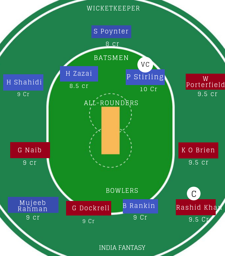 विकेटकीपर : S Poynter को पहले शामिल करें. क्योंकि M Shahzad और IK Khil में से कोई एक ही खिलाड़ी इस मैच में खेलेगा. लेकिन, पोएंटर जरूर खेलेंगे इसलिए बिना कन्फ्यूजन रखें, आयरलैंड के विकेटकीपर को शामिल करें.