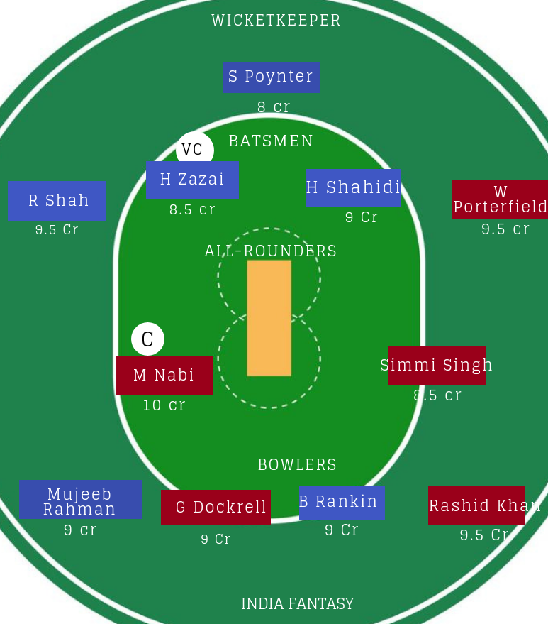 गेंदबाज : Rashid Khan, Mujeeb Ur Rahman, Sayed Shirzad (Doubt :Dawlat Zadran)