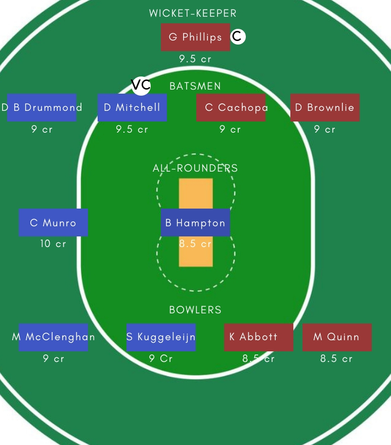 ऑलराउंडर – ऑलराउंडर के तौर पर Brett Hampton, Colin Munro सबसे अच्छे विकल्प होगें। Brett Hampton ने पिछले मैच में शानदार पारी खेली थी वही, वो गेंद से अहम योगदान दे सकते है।