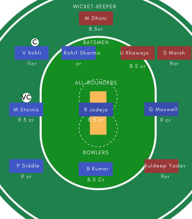 बल्लेबाज – बल्लेबाजी में Rohit Sharma, Shaun Marsh, Usman Khawaja, Virat Kohli सबसे अच्छे वकिल्प होगें। Rohit Sharma ने पिछले मैच में शानदार शतकीय पारी खेली थी। वही, Shaun Marsh ने शानदार अर्धशतक लगाया था।