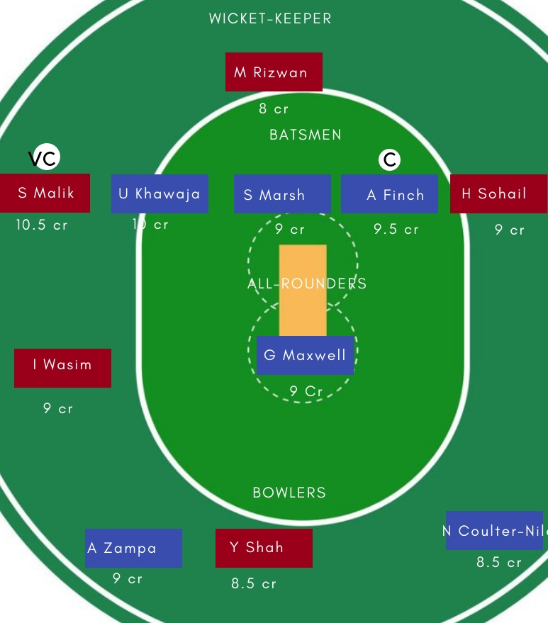बल्लेबाज – बल्लेबाजी में Aaron Finch, Shaun Marsh, Usman Khawaja, shoaib Malik, Haris Sohail सबसे अच्छे विकल्प होगें। Finch ने दोनों ही मैच में शानदार शतकीय पारी खेली है। जबकि Khawaja ने भी पिछले मैच में शानदार पारी खेली थी।