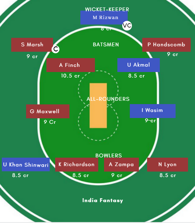 Australia (Playing XI): Aaron Finch(c), Usman Khawaja, Shaun Marsh, Peter Handscomb, Glenn Maxwell, Marcus Stoinis, Alex Carey(w), Kane Richardson, Nathan Lyon, Adam Zampa, Jason Behrendorff