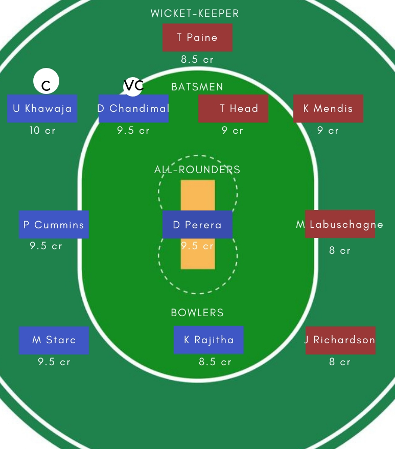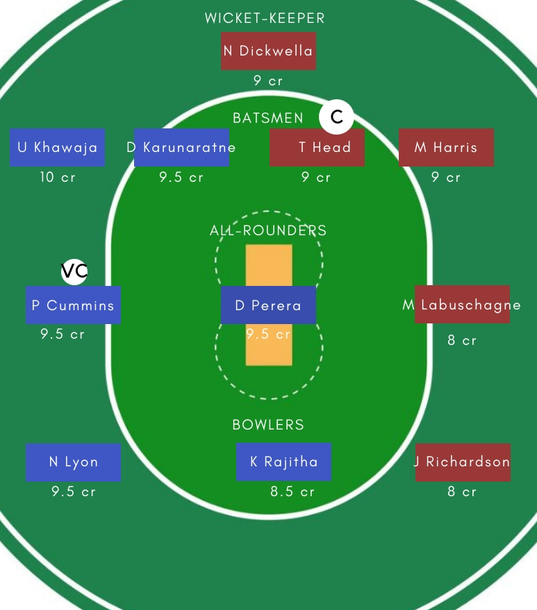 बल्लेबाज – बल्लेबाजी में Travis Head, Marcus Harris, Joe Burn, Kusal Mendis, Dimuth Karunaratne सबसे अच्छे विकल्प होगें। Travis Head ने पिछले मैच में शानदार इंनिग्स खेली थी। वही, Dimuth Karunaratne भी इस मैच में अहम योगदान दे सकते है।