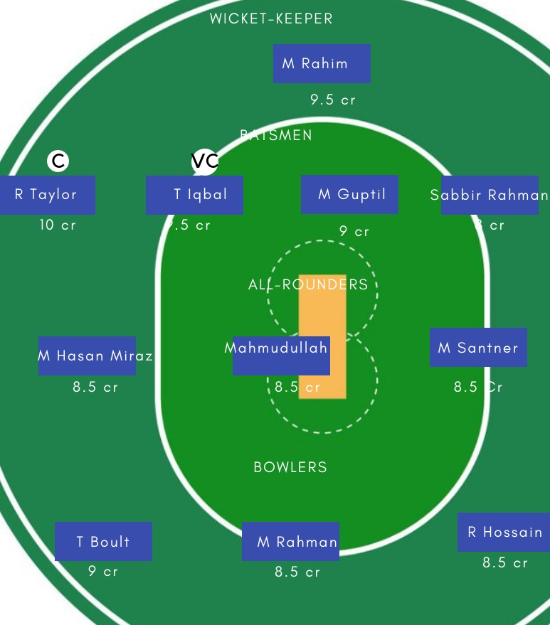 गेंदबाज – गेदबाजी में Trent Boult, Tim Southee, Mustafizur Rahman, Rubel Hossain सबसे अच्छे विकल्प होगें। Trent Boult ने हाल में ही भारत के खिलाफ शानदार प्रदर्शन किया था।