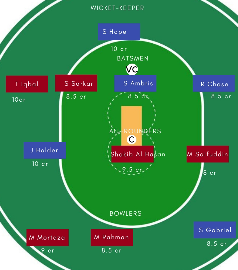 गेंदबाज – गेंदबाजी में Sheldon Cottrell, Shanon Gabriel, M Mortaza, M Rahman सबसे अच्छे विकल्प होंगे। Cottrell ने पिछले 6 मैचों में कुल 9 विकेट चटकाए है। जबकि Shannon Gabriel ने पिछले 5 मैचों में कुल 6 विकेट झटके है। M Rahman ने पिछले 5 मैचों में कुल 6 विकेट अपने नाम किए है।