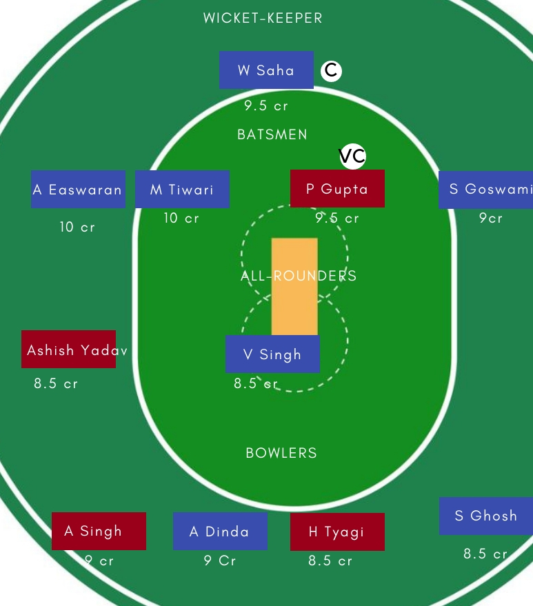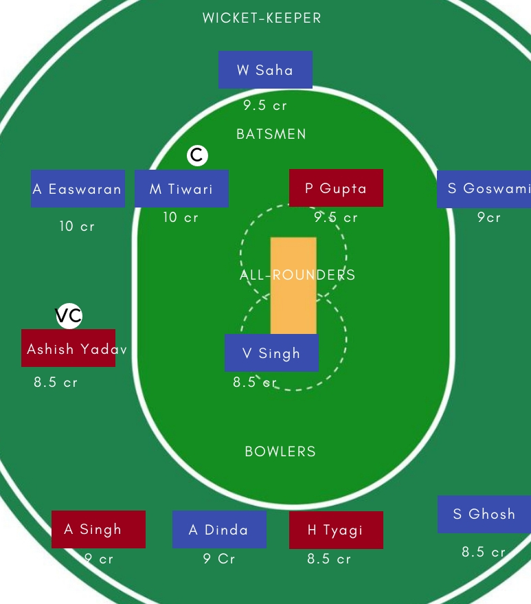 बल्लेबाज – बल्लेबाजी में Manoj Tiwari, Abhimanyu Easwaran, Prashant Gupta सबसे अच्छे विकल्प होगेंं। Easwaran ने इस सीजन अपनी बल्लेबाजी से काफी प्रभावित किया है। वही, Manoj Tiwari अकेले दम पर मैच का रुख पलटने का दम रखते है।