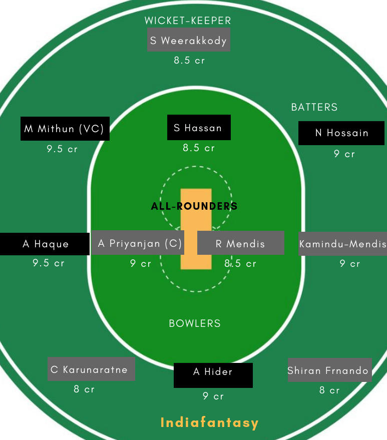 P Nissanka and Igalagamage will be expected to open the batting for the hosts, while Kamindu Mendis at number three is fresh from a solid knock of 61 in the last game. The skipper, Priyanjan comes in next, while Pryamal Pera who scored recently scored a half-century walks in at five. Ashen Bhandara, Ramesh Mendis and Karunaratne should be taking care of the lower middle order. In the bowling department, Sri Lanka A should persist with Ramesh Mendis, Shiran Fernando, and Karunaratne. Meanwhile, Priyanranjan could also chip in with the ball.