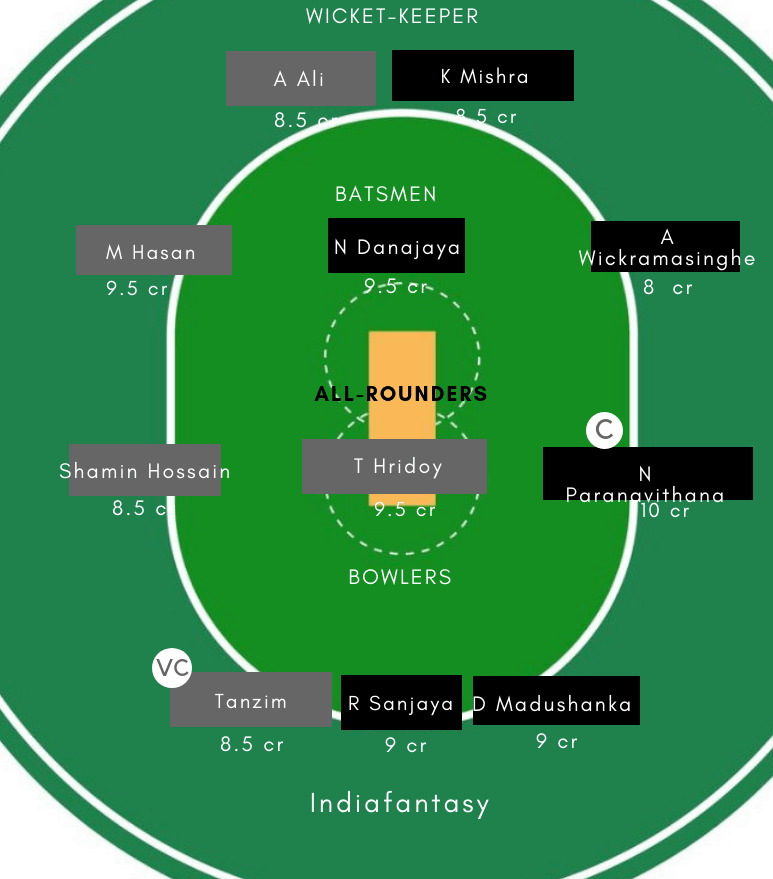 Yasiru Rodrigo replaced Dilshan Madushanka last time out Nipun Dananjaya (c), Kamil Mishara (wk), Navod Paranavithana, Rohan Sanjaya, Avishka Tharindu, Chamindu Wijesinghe, Dilshan Madushanka, Ravindu Rasantha, Ashian Daniel, Amshi de Silva, Ahan Wickramasinghe, Sandun Mendis, Thaveesha Kahaduwaarachchi, Kavindu Nadeeshan, Yasiru Rodrigo