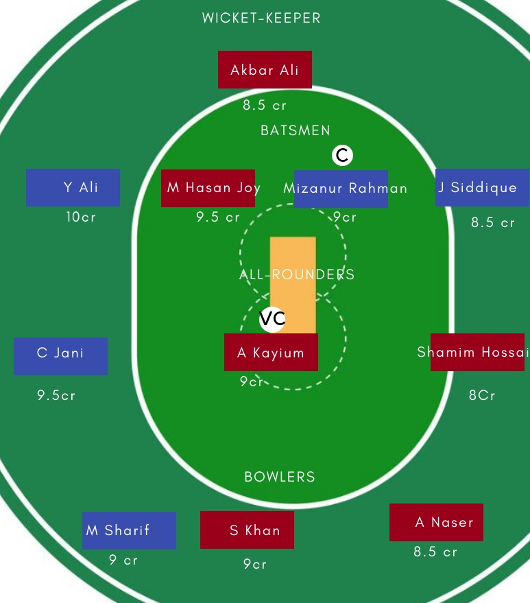 गेंबाज – गेदबाजी में Sumon Khan, Abu Naser, Mohammad Sharif, Mehedi Hasan सबसे अच्छे विकल्प होगें। Sumon Khan ने इस सीजन अच्छी गेदबाजी का प्रदर्शन किया है। जबकि Mehedi Hasan ने बेहद किफायती गेंदबाजी की है।