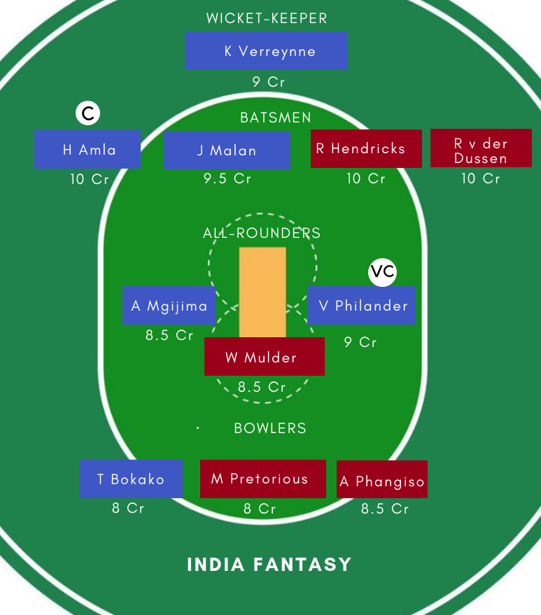 Malusi Siboto, Nono Pongolo, Aaron Phangiso, Migael Pretorius, Temba Bavuma (c), Reeza Hendricks, Rassie van der Dussen, Bjorn Fortuin, Wiaan Mulder, Dwaine Pretorius, Ryan Rickelton (wk)