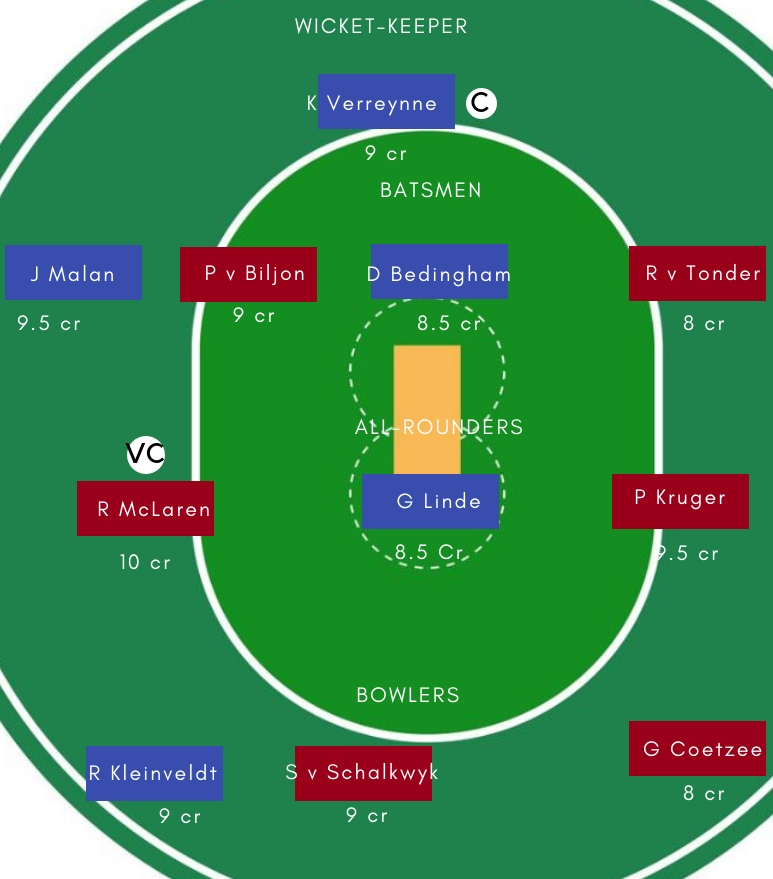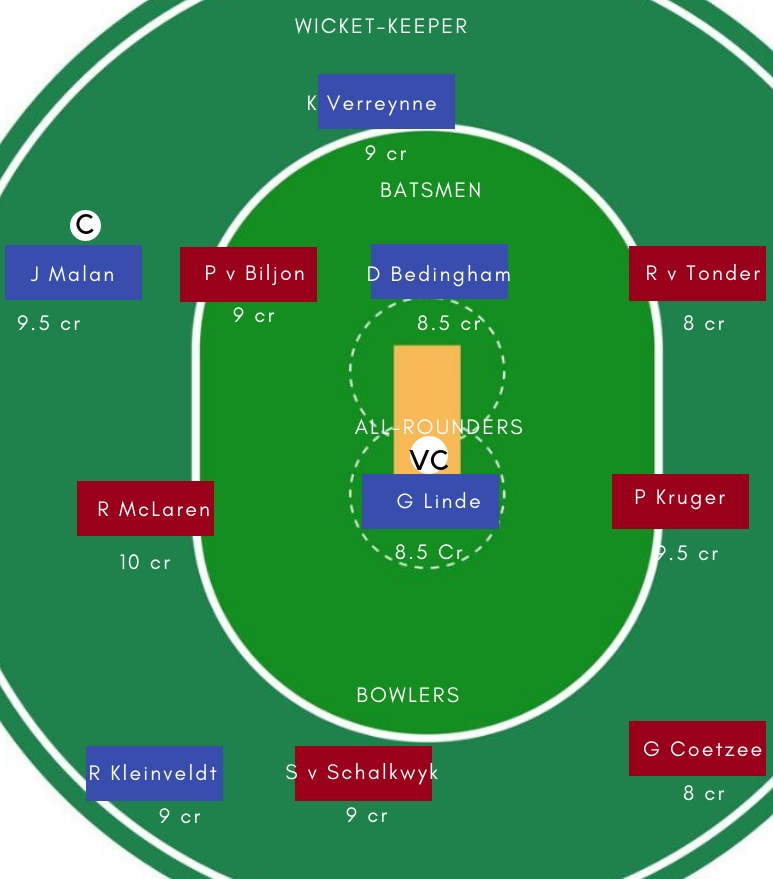 बल्लेबाज – बल्लेबाजी में Janneman Malan,David Bedingham, Petrus van Biljon , R van Tonder सबसे अच्छे विकल्प होंगे। Janeman Malan इस सीजन अच्छी लय में नजर आए है। वो टूर्नामेंट में एक शतक भी जड चुके है।