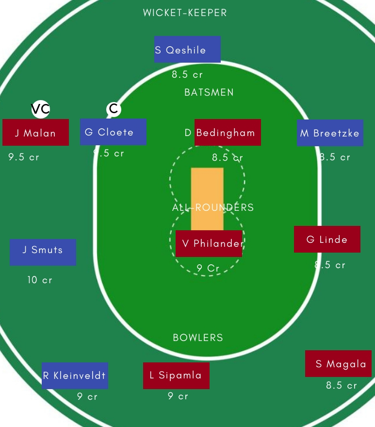 बल्लेबाज – बल्लेबाजी में K Verreynne, G Cloete, M Bretzke, Janeman Malan सबसे अच्छे विकल्प होगें। K Verreynne ने पिछले मैच मे शानदार 44 रनों की पारी खेली थी। वही, G Cloete ने पहले मैच में बल्ले से अहम योगदान दिया था।
