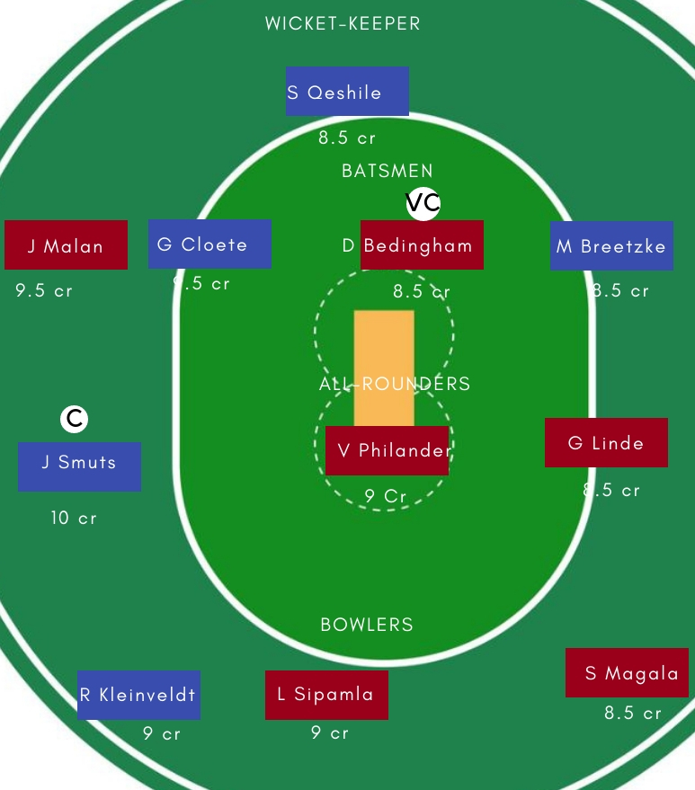 ऑलराउंडर – ऑलराउंडर के तौर पर V Philander, G Linde, JJ Smuts सबसे अच्छे विकल्प होगें। G Linde बल्ले और गेंद दोनों से अहम योगदान दे सकते है। जबकि JJ Smuts अकेले दम पर मैच का रुख पलटने का माद्दा रखते है।