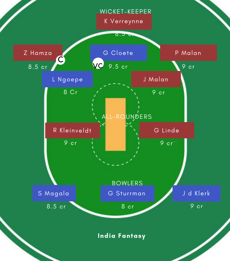 Rory Kleinveldt, Aviwe Mgijima, Akhona Mnyaka, Janneman Malan, Pieter Malan, Zubayr Hamza, Kyle Verreynne (wk), Dayyaan Galiem, Vernon Philander, Dane Piedt (c), Tsepo Ndwandwa