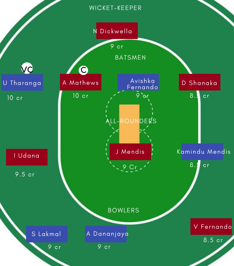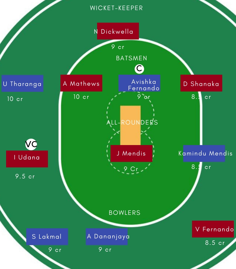 ऑलराउंडर – ऑलराउंडर के तौर पर Isuru Udana, Jeevan Mendis, Kamindu Mendis सबसे अच्छे विकल्प होगें। Udana ने हाल में बल्ले और गेंद दोनों से शानदार प्रदर्शन किया है। जबकि Kamindu Mendis भी उपयोगी साबित हो सकते है।
