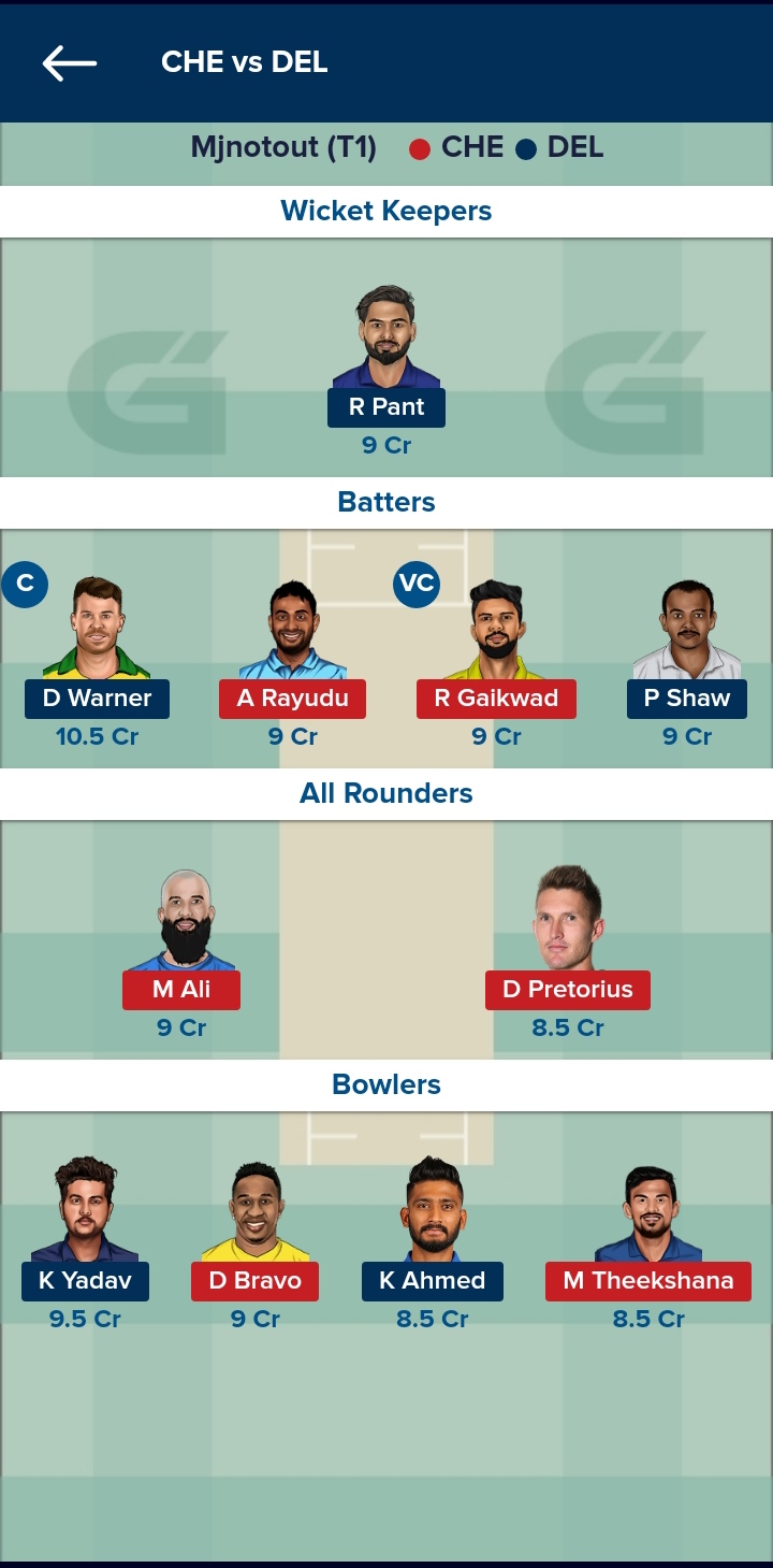 WICKET-KEEPERS: Rishabh Pant BATSMEN: David Warner, Ambati Rayudu, Ruturaj Gaikwad, Prithvi Shaw ALL-ROUNDERS: Moeen Ali, Dwaine Pretorius BOWLERS: Kuldeep Yadav, Khaleel Ahmed, Dwayne Bravo, Maheesh Theekshana