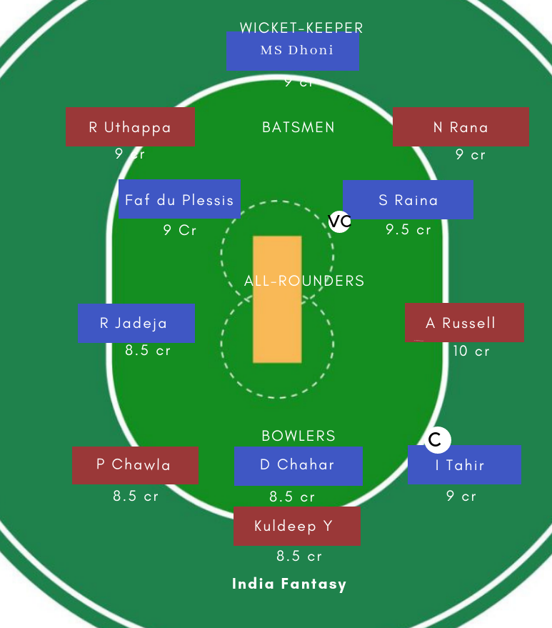 Harbhajan Singh, Ambati Rayudu, Faf du Plessis, Shane Watson, Ravindra Jadeja, Suresh Raina, MS Dhoni (c, wk), Kedar Jadhav, Deepak Chahar, Scott Kuggeleijn, Imran Tahir.