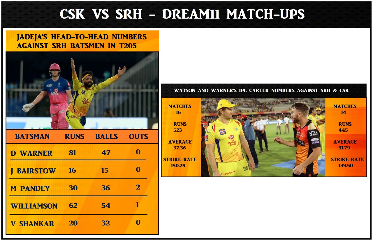 Jadeja has been enduring a bad season so far in UAE where he was expected to dominate, but things could come back to normalcy during this fixture against SRH with a load of right-handers packed between Warner at the top and Abhishek Sharma in the middle. With the long boundaries and the assistance to finger-spinners at Dubai, Jadeja will exploit this match-up. Similarly, Abhishek Sharma has an advantage with a similar right-hand dominant CSK batting unit.