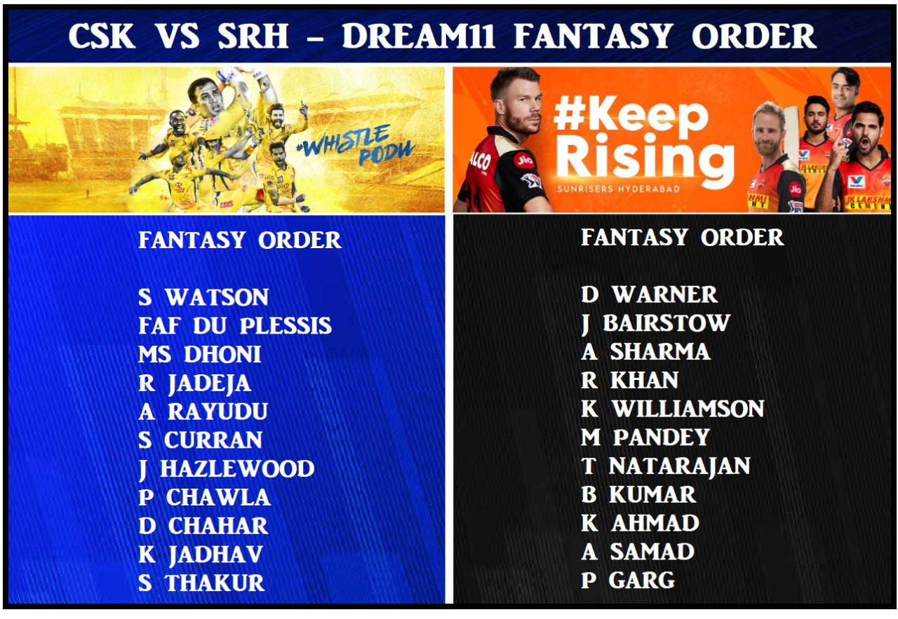 Possible CSK Dream11 Playing 11 – S Watson A Rayudu Faf Du Plessis K Jadhav MS Dhoni (C & WK) S Curran R Jadeja P Chawla D Chahar J Hazlewood S Thakur