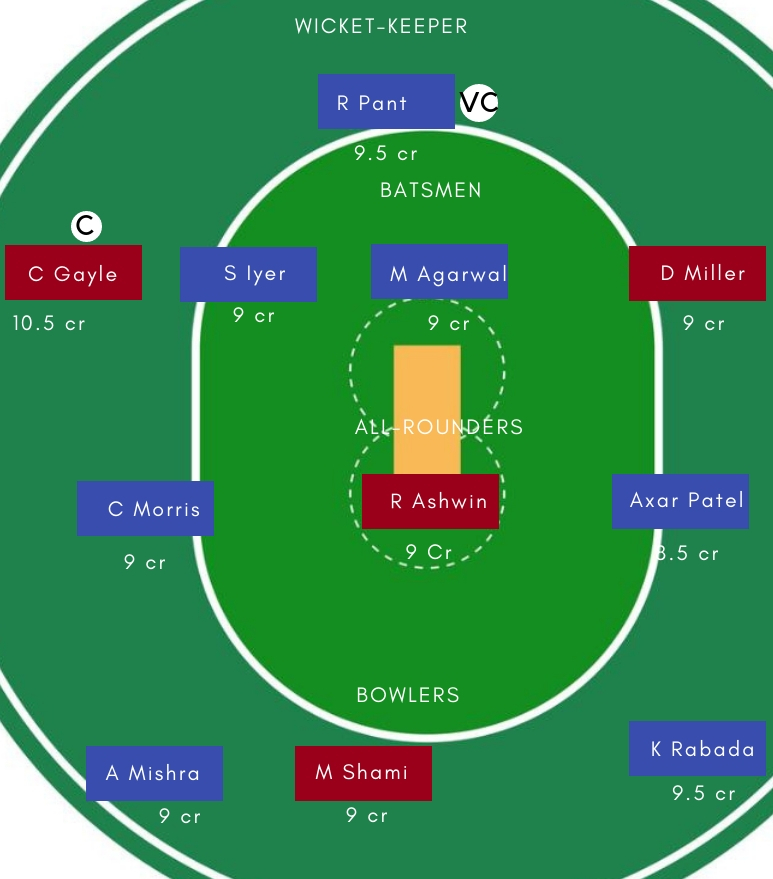 गेंदबाज –  गेंदबाजी में Mohammad Shami, Kagiso Rabada, I Sharma, M Ashwin सबसे अच्छे विकल्प होंगे। Mohammad Shami इस सीजन 9 मैचोंं में कुल 12 विकेट चटका चुके है। जबकि Kagiso Rabada ने इस सीजन सबसे ज्यादा विकेट अपने नाम किए है। Rabada अबतक 9 मैचों में कुल 19 विकेट ले चुके है।