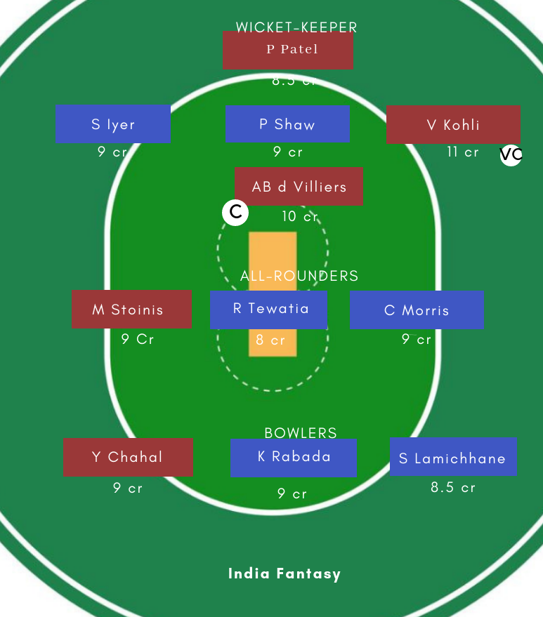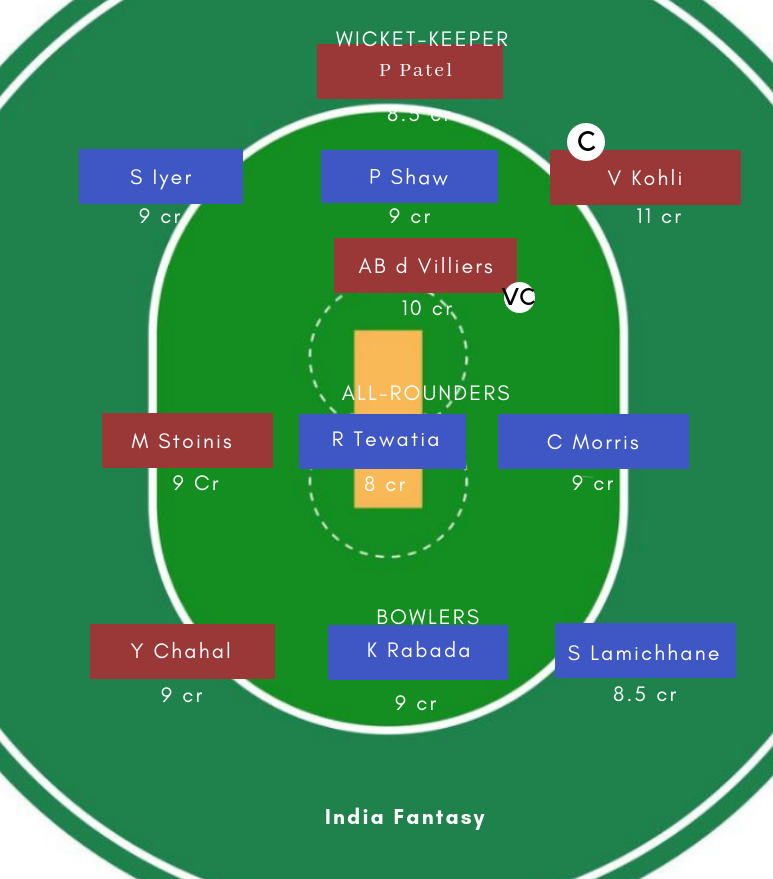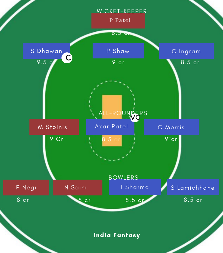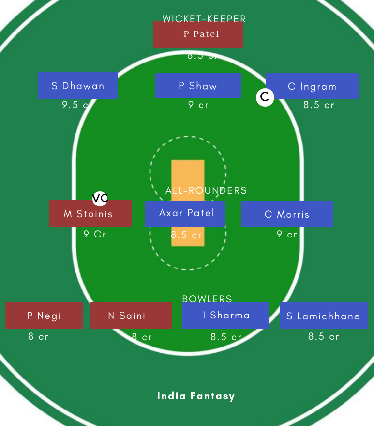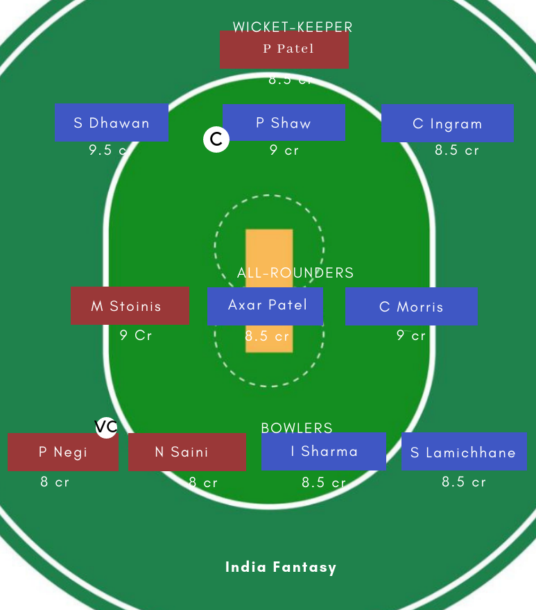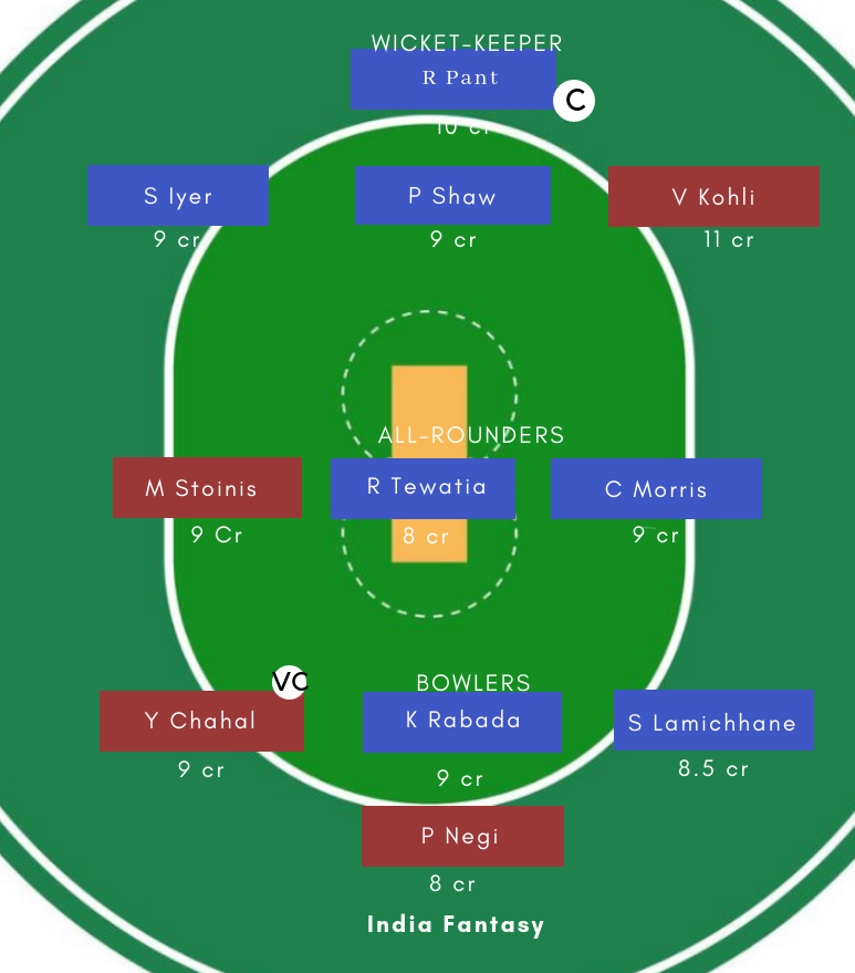 Colin Ingram, Rishabh Pant (wk), Ishant Sharma, Shikhar Dhawan, Chris Morris, Shreyas Iyer (c), Kagiso Rabada, Rahul Tewatia, Sandeep Lamichhane, Axar Patel, Prithvi Shaw