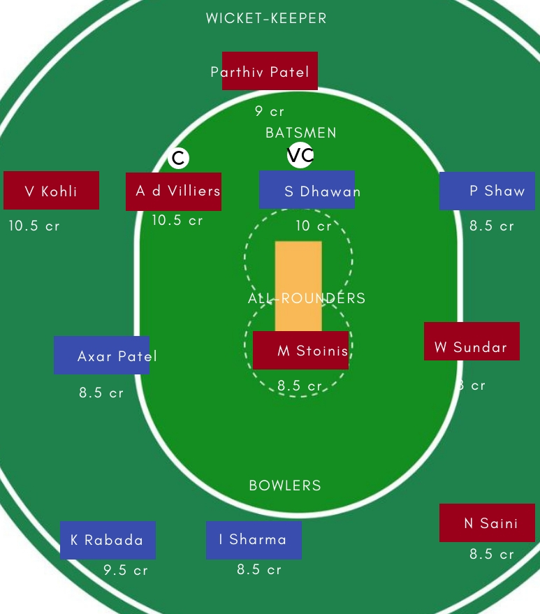 बल्लेबाज – बल्लेबाजी में Virat Kohli, Ab Devilliers, Shreyas Iyer, Shikhar Dhawan सबसे अच्छे विकल्प होंगे। Shikhar Dhawan इस सीजन 11 मैचों में 40 की औसत से 401 रन बना चुके है। जबकि Ab Devilliers ने 10 मैचो में 59 की औसत से 414 रन बनाए है।