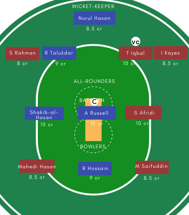 Comilla Victorians– Imrul Kayes (c), Sanjit Saha, Waqar Salamkheil, Mosharraf Hossain, Tamim Iqbal, Wahab Riaz, Shahid Afridi, Aamer Yamin, Shamsur Rahman, Anamul Haque, Mohammad Saifuddin, Mahedi Hasan, Mohammad Shahid, Ziaur Rahman, Thisara Perera, Liam Dawson.