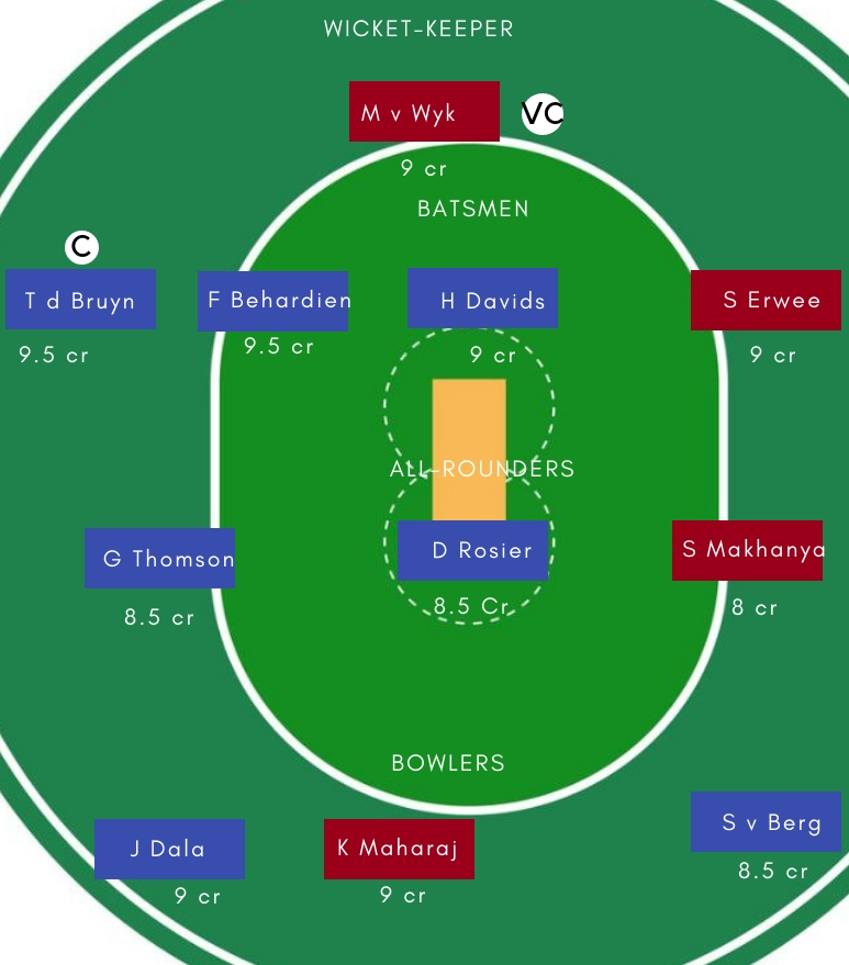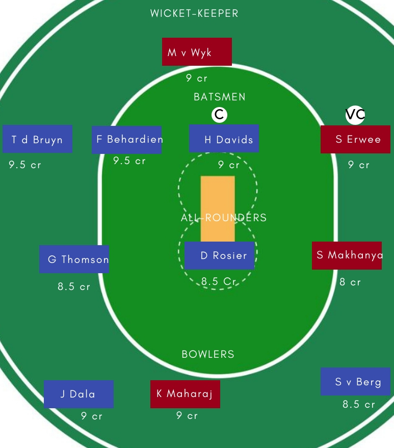 बल्लेबाज – बल्लेबाजी में H Davids, T de Zorzi, T De Bruyn,Sarel Erwee, Cody Chetty, Khaya Zondo सबसे अच्छे विकल्प होंगे। T De Bruyn इस सीजन बढिया फॉर्म में नजर आए है। जबकि H Davids ने भी बल्ले से अहम योगादन दिया है।
