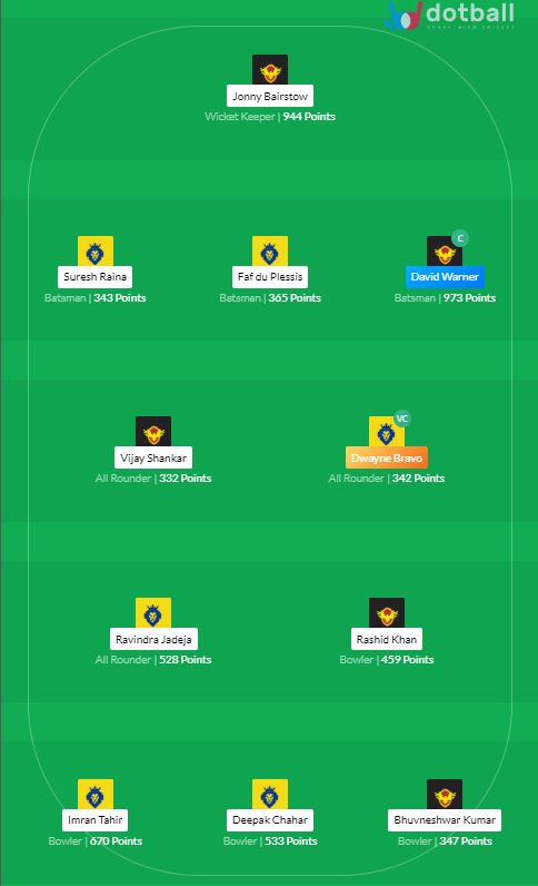 SunRisers Hyderabad –Jonny Bairstow, David Warner, Shakib Al Hasan/Mohammad Nabi, Vijay Shankar, Deepak Hooda/Manish Pandey, Yusuf Pathan, Bhuvneshwar Kumar, Rashid Khan, Shahbaz Nadeem, Khaleel Ahmed, Sandeep Sharma