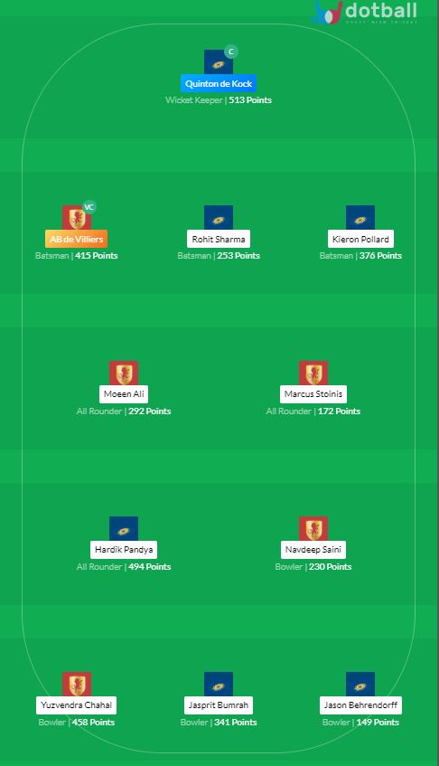 Batsman: AB de Villiers (RCB, 10 Cr), V Kohli (RCB, 11 Cr), R Sharma (MI, 10 Cr), K Pollard (MI, 9 Cr)