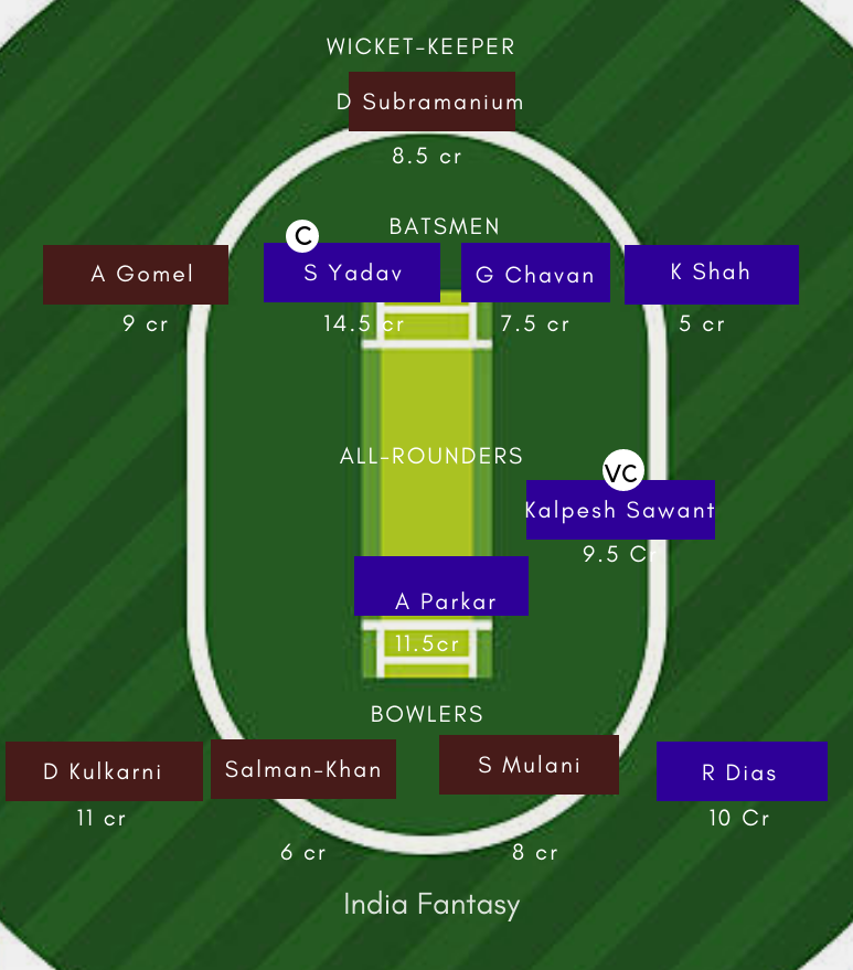Ajay Pandey, Doraiswamy Subramanian, Kaustubh Pawar, Suryansh Shedge, Y Pawar, Aakarshit Gomel, Arjun Tendulkar, Bhavin Thakkar, Nehal Katakdhond, Shams Mulani, Siddharth Akre, Akash Anand (wk), Mehboob Shaikh (wk), Anjdeep Lad, Dhawal Kulkarni (c), Minad Manjrekar, Salman Khan, Sylvester Dsouza