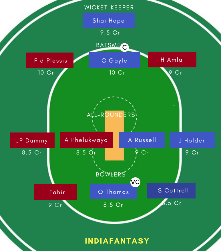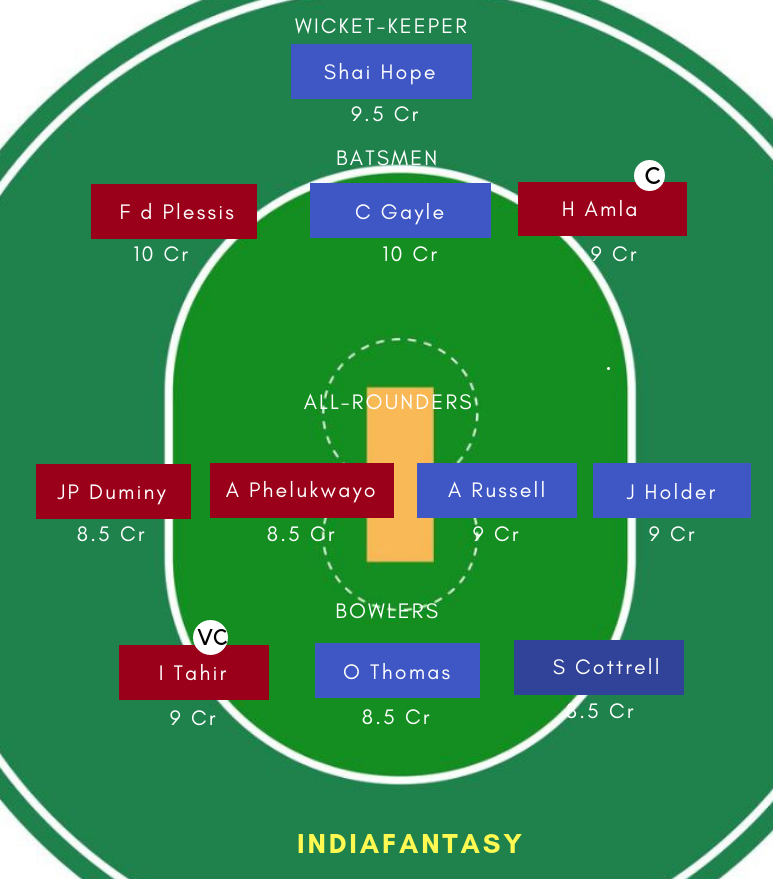 Andile Phehlukwayo, Dwaine Pretorius, Imran Tahir, Hashim Amla, Chris Morris, JP Duminy, Lungi Ngidi, Aiden Markram, K Rabada, Tabraiz Shamsi, Quinton de Kock (wicket-keeper), David Miller, Dale Steyn, Faf du Plessis (captain), Rassie van der Dussen