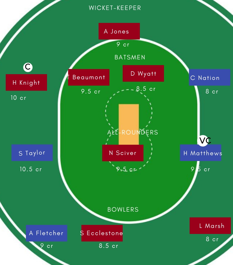 गेंदबाज – A Shrubsole, S Ecclestone, K Brunt, L Marsh, K Cross