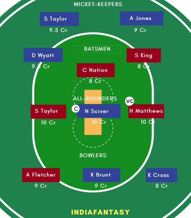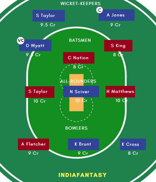 Amy Jones, Tammy Beaumont, Sarah Taylor (wk), Fran Wilson, Linsey Smith, Danni Wyatt, Nat Sciver, Anya Shrubsole (c), Sophie Ecclestone, Kate Cross, Katherine Brunt.