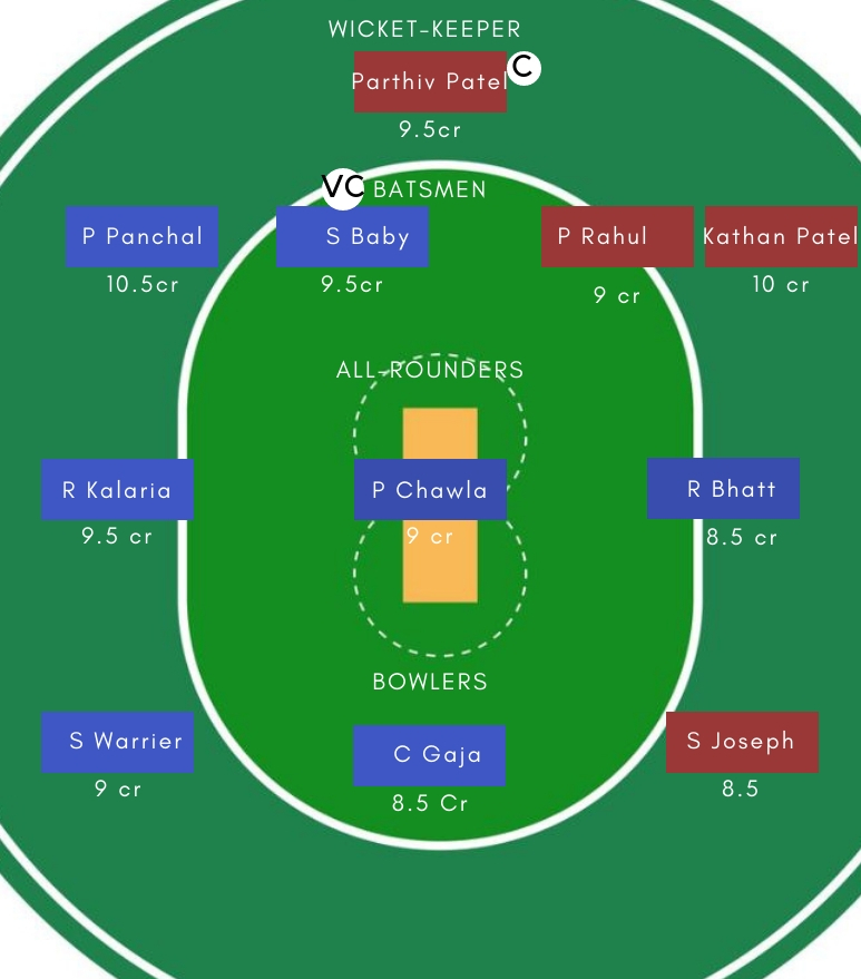 बल्लेबाज – बल्लेबाजी में Priyank Panchal, Sachin Baby, Sanju Samson, Kathan Patel सबसे अच्छे विकल्प होगें। Priyank Panchal ने इस सीजन शानदार बल्लेबाजी का प्रदर्शन किया है। वही, Sachin Baby ने पिछले मैच में जबर्दस्त बल्लेबाजी की थी।