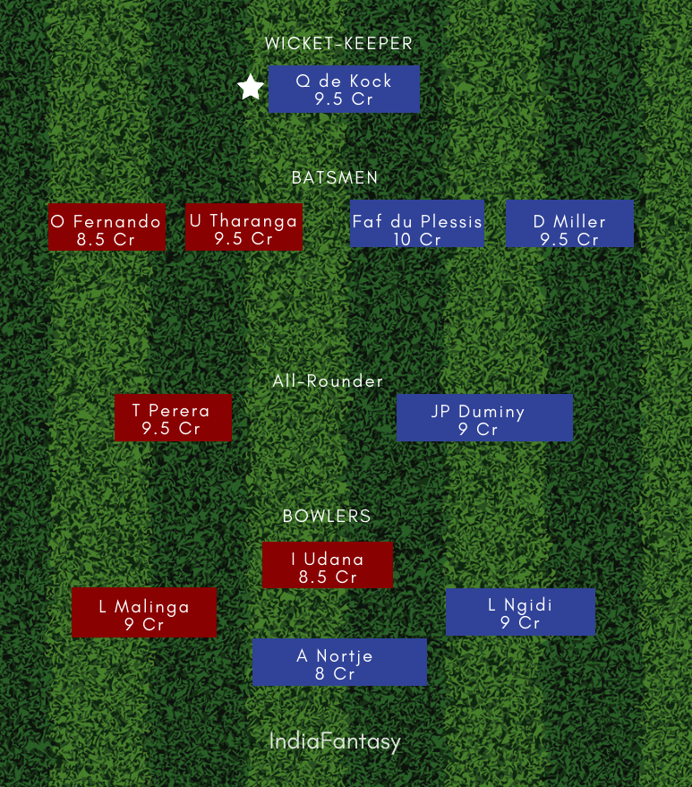 South Africa – Quinton de Kock, Reeza Hendricks, Aiden Markram, Faf du Plessis, David Miller, JP Duminy, Andile Phehlukwayo, Dale Steyn, Anrich Nortje, Lungi Ngidi, Tabraiz Shamsi