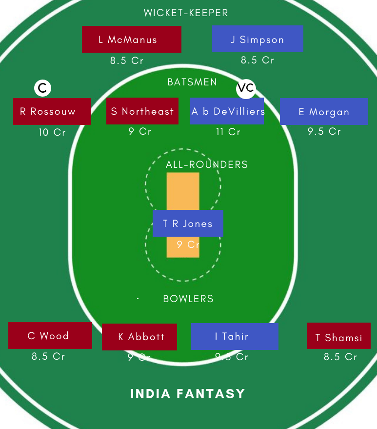 Kyle Abbott, Brad Taylor, Tom Alsop, Rilee Rossouw, James Fuller, Lewis McManus, James Vince (C), Liam Dawson, Sam Northeast, Ian Holland, Chris Morris, Ryan Stevenson, Chris Wood