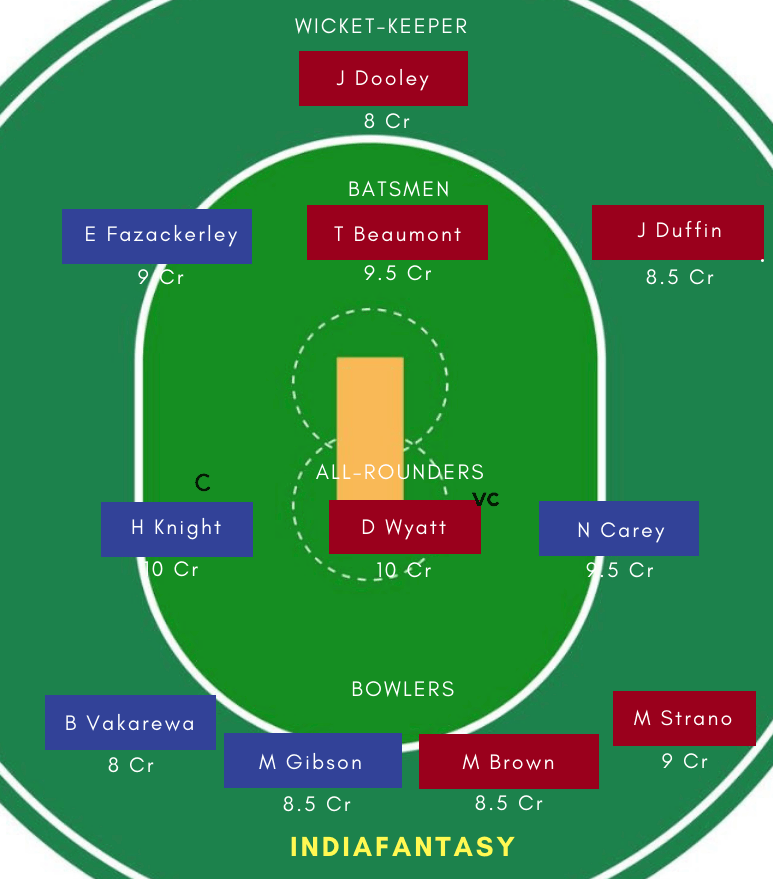 Belinda Vakarewa, Maisy Gibson, Meg Phillips, Heather Knight, Chloe Tryon, Fran Wilson, Nicola Carey, Emily Smith (wk), Corinne Hall (c), Erin Fazackerley, Tayla Vlaeminck