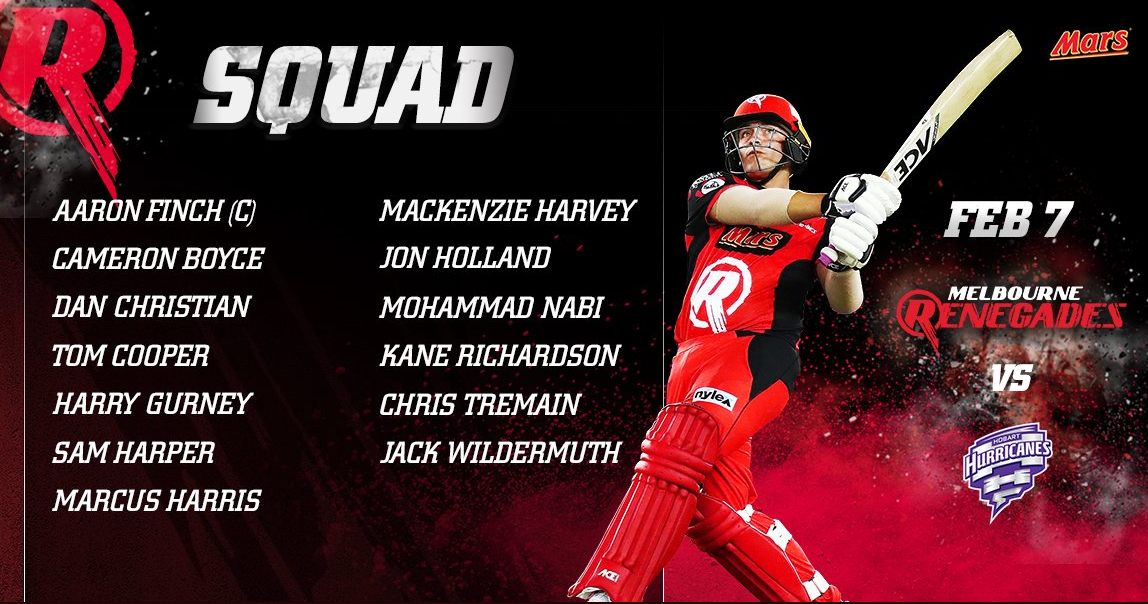 Melbourne Renegades squad: Aaron Finch (C), Jon Holland, Cameron Boyce, Dan Christian, Tom Cooper, Sam Harper, Marcus Harris, Mackenzie Harvey, Mohammad Nabi, Kane Richardson, Chris Tremain, Harry Gurney, Jack Wildermuth