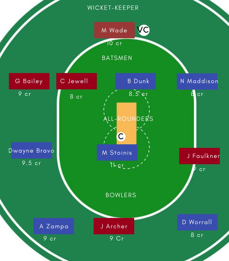 ऑलराउंडर – ऑलराउंडर के तौर पर James Faulkner, Marcus Stoinis सबसे अच्छे विकल्प होगें। Stoinis इस समय बेहद शानदार फॉर्म में मौजूद है। पिछले मैचों में उन्होने बल्ले और गेंद दोनो से अहम योगदान दिया है।